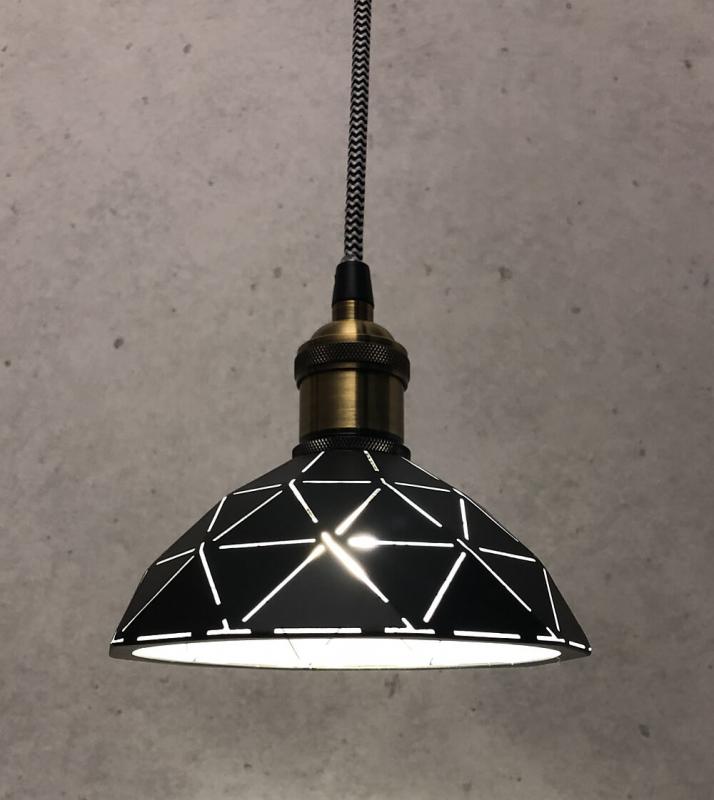 Svart fönsterlampa med vit insida från Oriva i laserskuren tunn metall som bildar ett härligt mönster, levereras med upphäng i antikmässing och textilsladd.