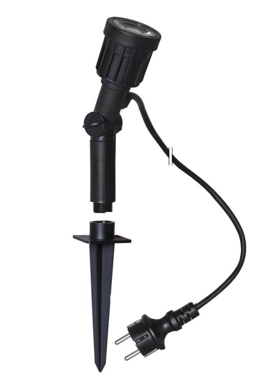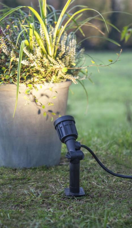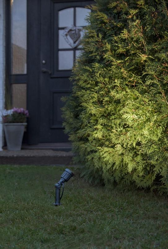 Smidig liten spotlight för utomhusbruk, komplett med LED lampa och 5 meter anslutningskabel med stickkontakt. Perfekt att belysa ett mindre träd med!