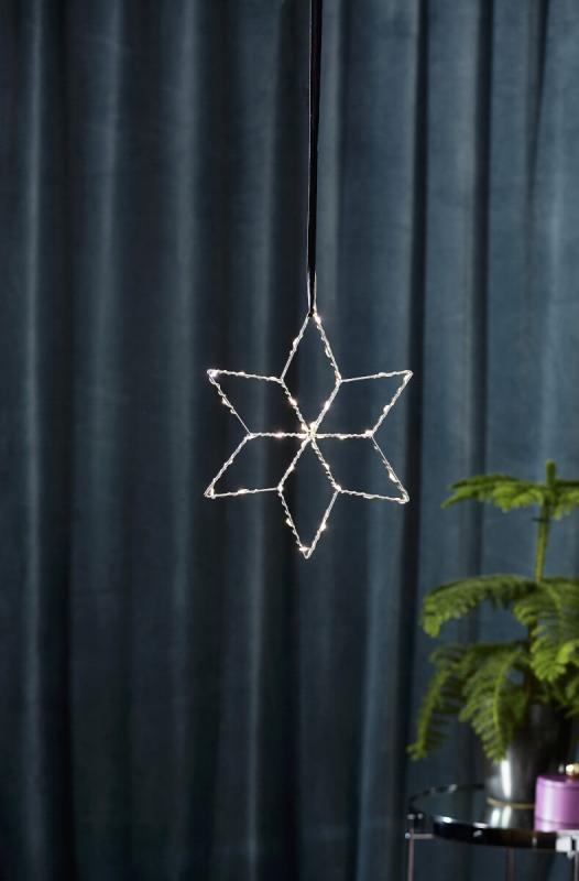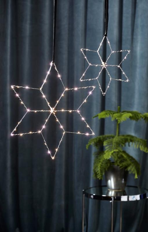 Så vacker metallstjärna i silver som lyser med den mer och mer populära lite vitare tonen kallad daylight. Lolly finns i 2 storlekar och passar lika bra i fönstret som mot en vägg, bara fantasin sätter gränserna här ser du den lilla på 36 cm