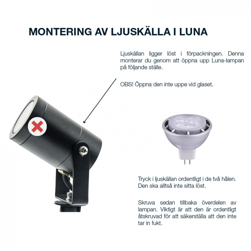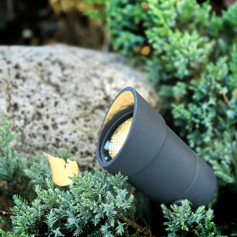 Mörkgrå allround markspot i aluminium med precis lagom ljusspridning till små samt medelstora träd och buskar. Luna är ett bra val till ex. belysning av prydnadsgräs, hortensior och andra ljusgenomsläppliga växter. Ett tips är att du sticker ner lampan rakt i centrum på växten för stämningsfull ljusbild mellan skuggorna och ljuset. På breda lägre träd som ses från olika håll, kan du med fördel använda två lampor.