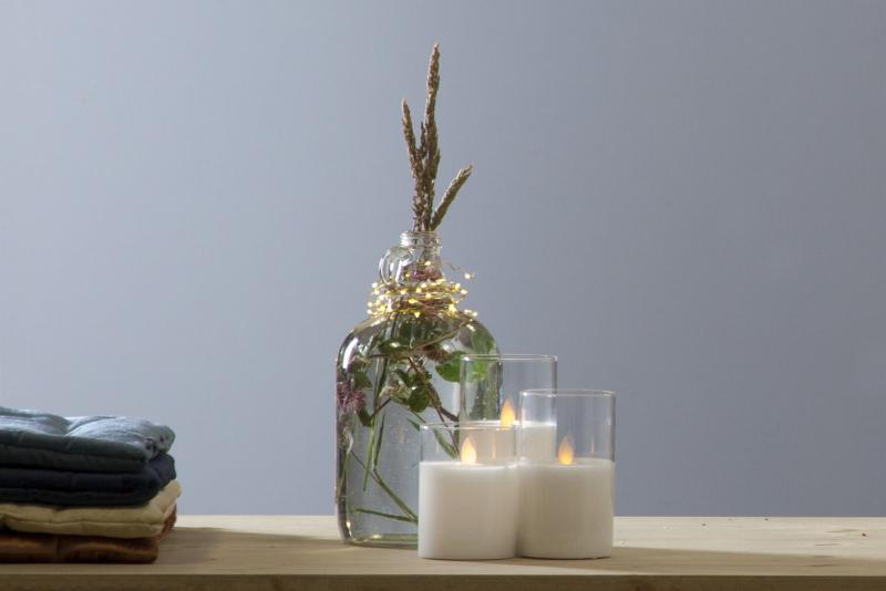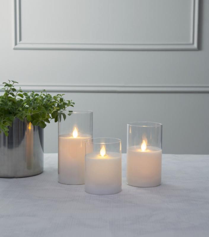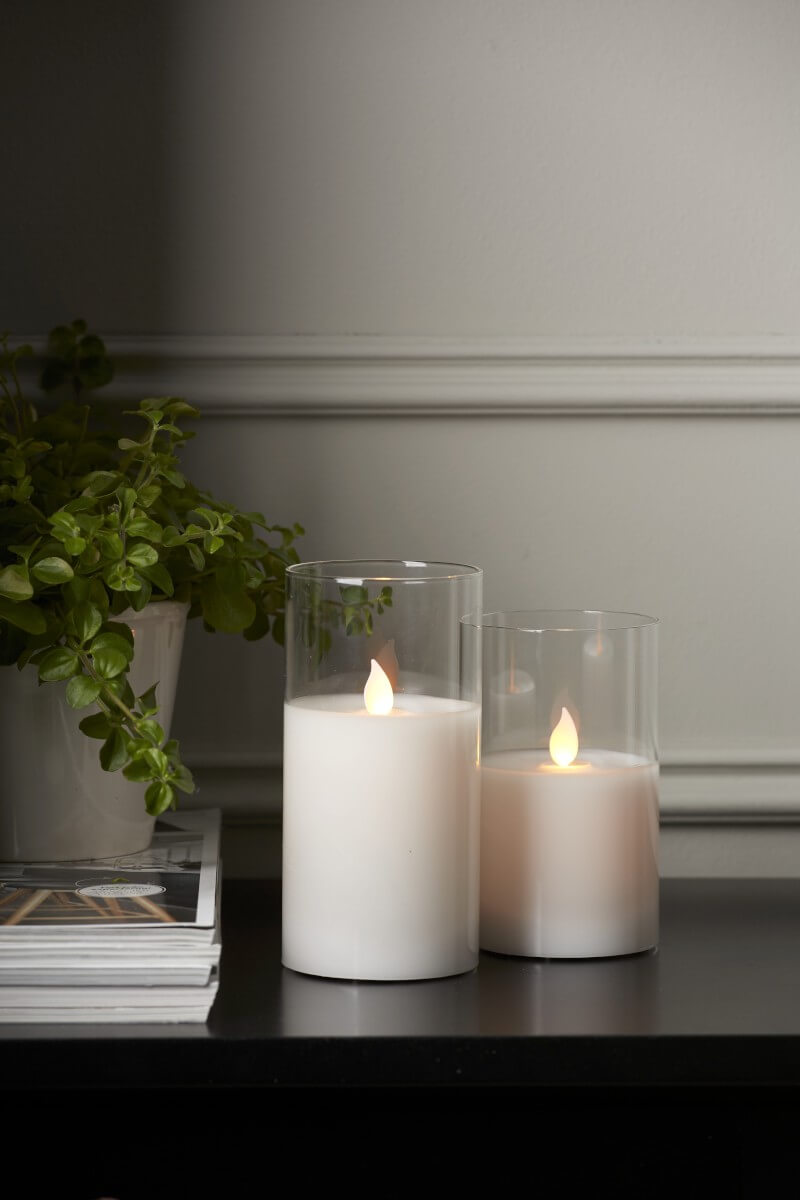 Glashållare med vaxljus i mitten, Twinkle flamman lyser med ett naturligt varmvitt gult sken. Timerfunktion gör det enkelt att ställa in när ljuset ska lysa.