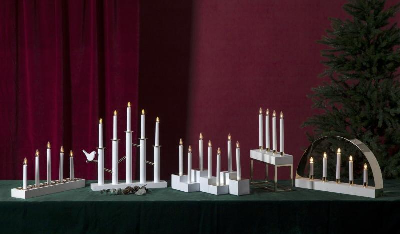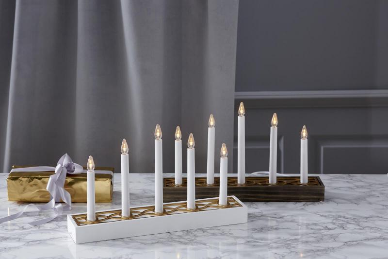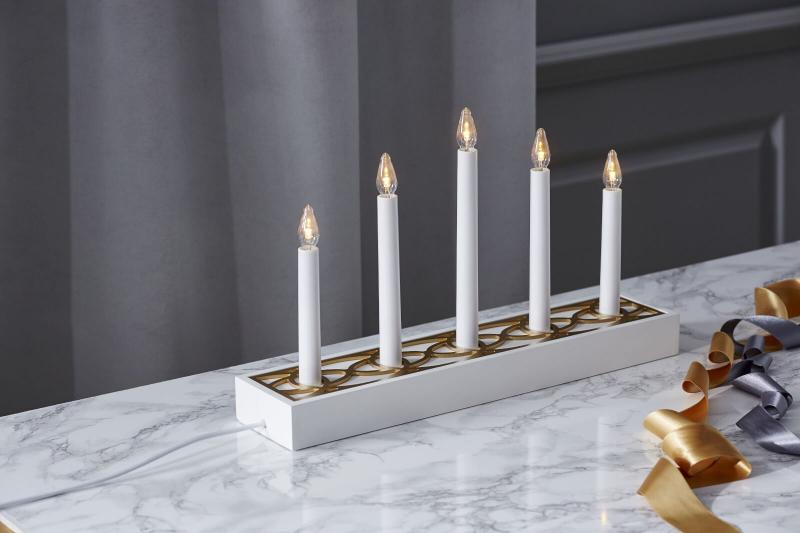 Vit träljusstake från Star Trading med gulddekorationer. Magic box har 5 LED-ljuskällor med varmvitt mysigt sken. En dekorativ ljusstake som helt säkert sprider julstämning i hemmet.