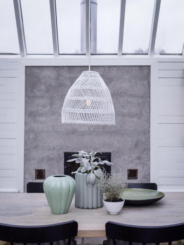 Maja takskärm i en vacker tvinnad vitfärgad rotting från välkända PR-Home. Passar lika bra utomhus under tak, i växthus och uterum som inomhus vart bestämmer du helt själv. Levereras med vitt sladdställ, 1,2 m och takkopp. Ska du ha den utomhus? tänk då på att istället använda ett sladdställ för utomhusbruk (Flex out) och att väder och vind kan komma att påverka utseendet. Maja finns i flera olika storlekar och färger. Här ser du maja Vit rotting 36 centimeter.