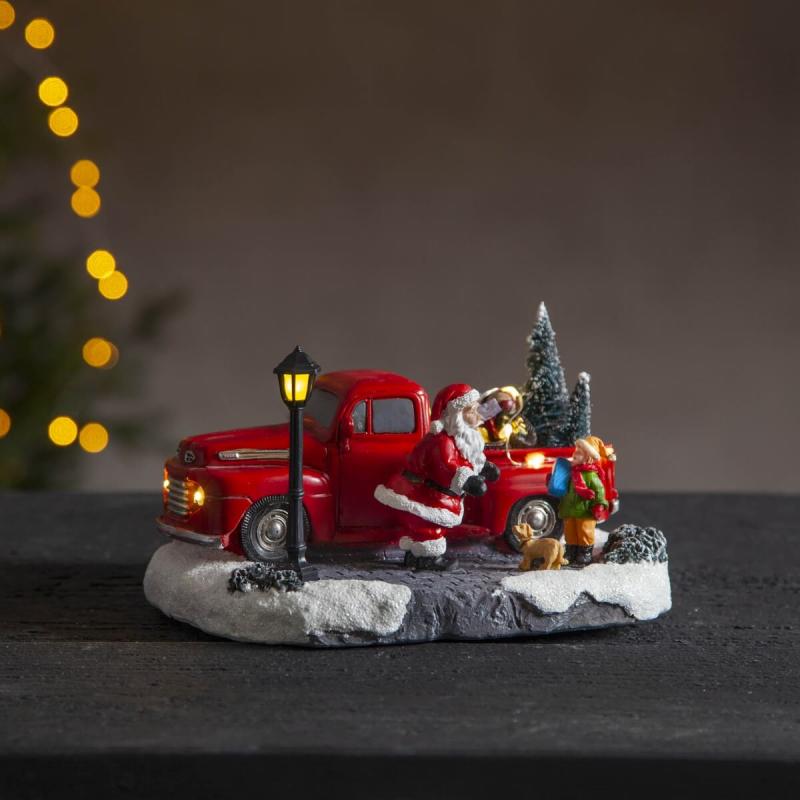 Så söt liten dekoration, Tomten har stannat på sin färd för att prata lite med barnen, Flertalet varmvita dioder lyser upp figuren på sin plats i en hylla eller kanske på byron i hallen. Drivs med batterier och har självklart en inbyggd timer så du enkelt kan ställa in när du vill att den ska lysa.
