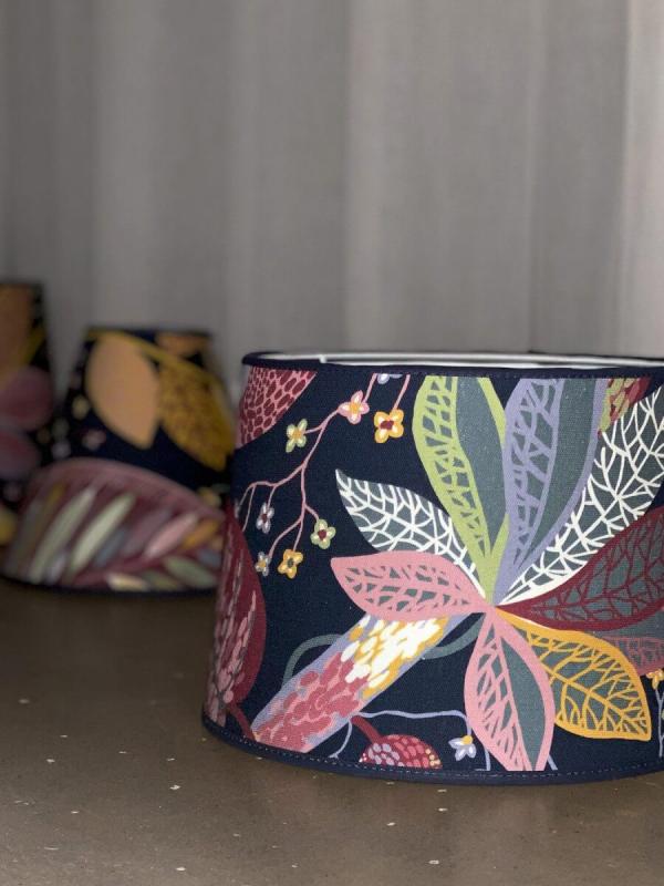 Vackra Mia är en serie lampskärmar från välkända PR-Home hon finns i hela 5 olika storlekar och en rad härliga färger, material och mönster. Här ser du Mia mönstrad i tyget Frank Marin 17 cm.