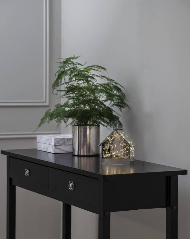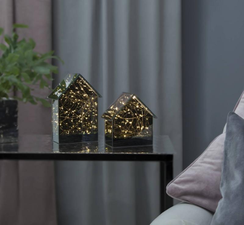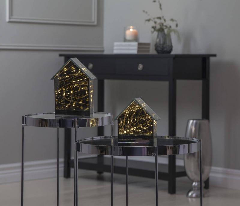 Batteridriven lykta i form av ett spegelhus. En härlig 14,5 cm hög dekoration att inreda med i ditt hem. Lyktan har LED-belysning med varmvitt sken. Timerfunktionen gör det enkelt att ställa in när lyktan ska lysa