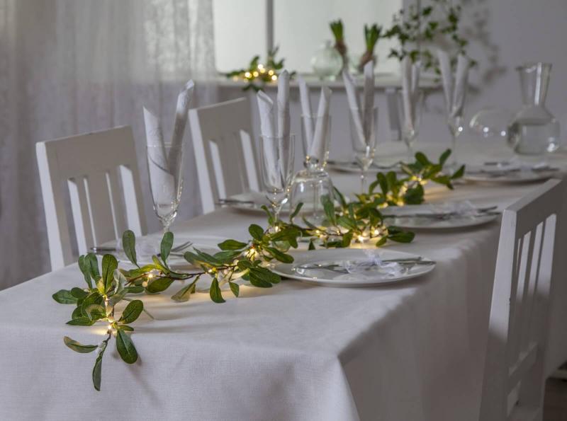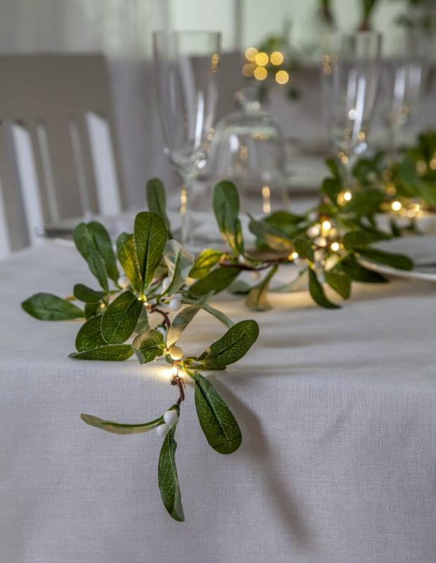 Vacker mistel girlang från Star Trading att dekorera med. Lyser med 20 varmvita dew drops mellan de gröna bladen. Går att lysa upp med timer eller utan.