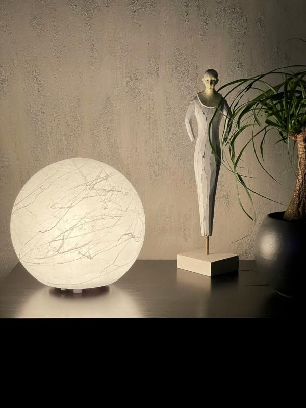 Kul bordslampa med marmorerat mönster som ger ett mjukt och behagligt sken. Här ser du stora Moon 25 centimeter.