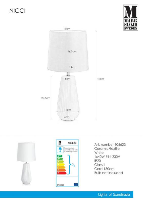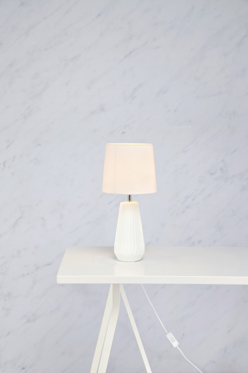 Nicci är en komplett lampa med vit keramik fot och vit textilskärm med en höjd på hela 41cm.