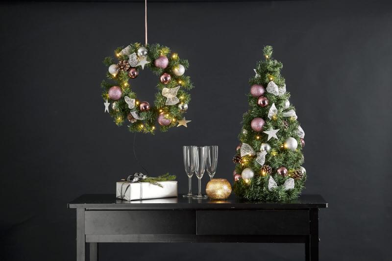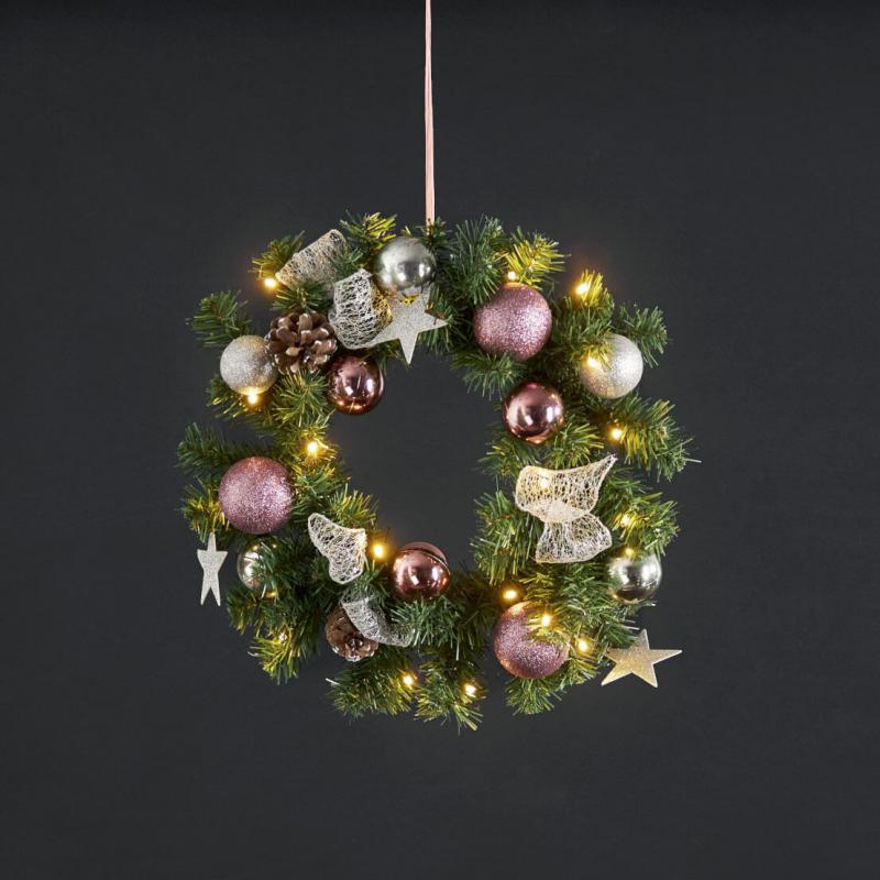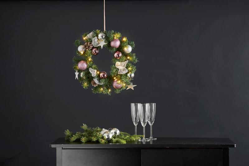 Vacker krans med dekorationer i silver och rosa. Lyser upp med 20 härligt varmvita LED. Kransen har en inbyggd timer och är batteridriven.