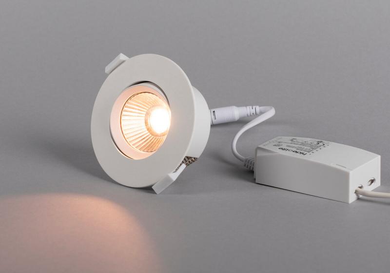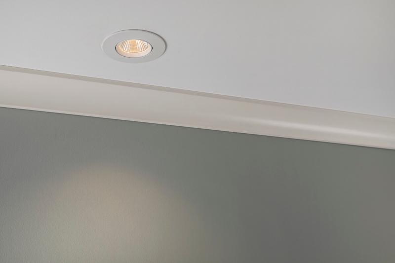 Lågbyggande, effektiv och vridbar Vit downlight från hide-a-lite med en färgtemperatur på 4000K, anpassad för montage i glespanel 28mm och godkänd för montage direkt mot isolering. Modern LED- och reflektorteknik ger högt ljusutbyte med distinkt och väl avbländad ljusbild med mycket god färgåtergivning, RA>95. En lättinstallerad IP44-armatur för badrum och utomhus, komplett med fasdimringsbart drivdon, 3-polig snabbplint för vidarekoppling samt dragavlastning för kabel eller flexslang 16mm. Dimbar med de vanligaste dimrarna på marknaden. Helt enkelt en toppenbra smidig downlight.
