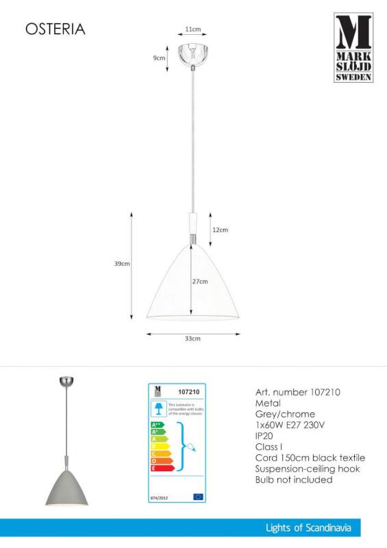 OSTERIA Taklampa 1L 33cm Grå/Krom