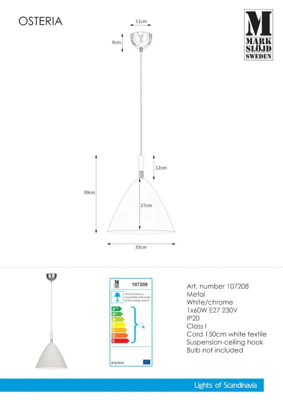 OSTERIA Taklampa 1L 33cm Vit/Krom