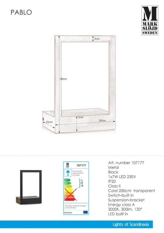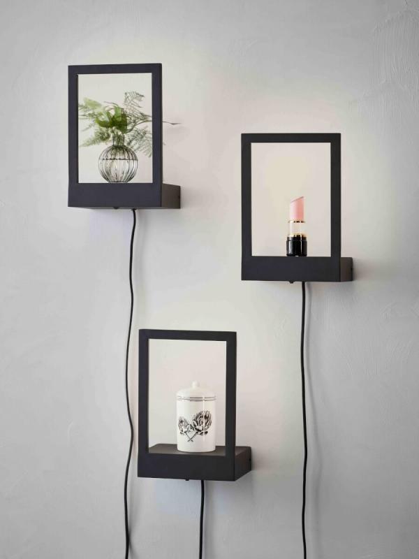 Pablo vägglampa /dekoration från Markslöjd. Hylla med "tavelram" med fast LED belysning. Svartlackerad metall. Inbyggd strömbrytare. 2m transparent sladd