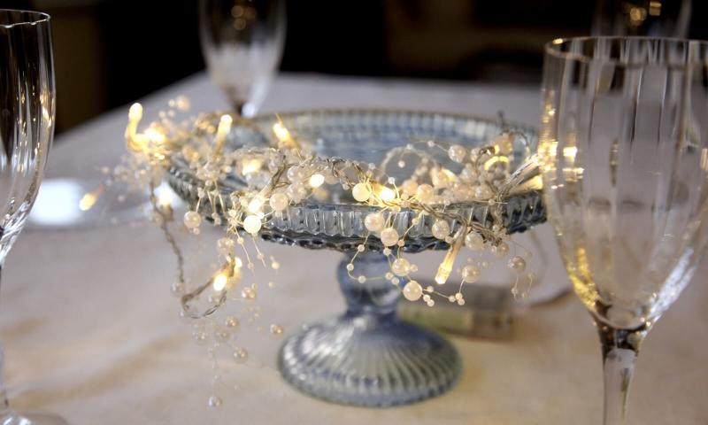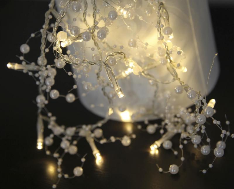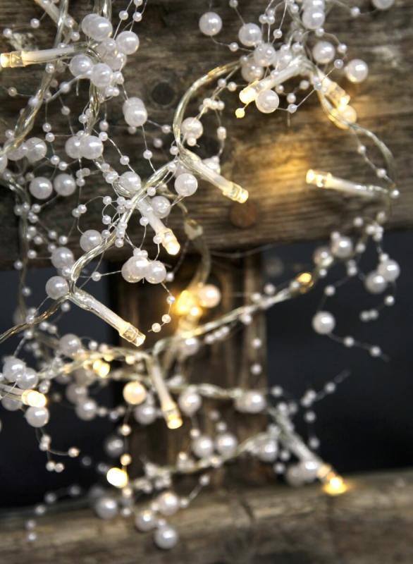 Vacker dekorationsslinga med 20 stycken LED-ljuskällor med vita pärlor. Kan användas vid diverse dekorationer, vid tex dukningar, blomsterarrangemang, i fönster, på väggen osv. Slingan är batteridriven och har timerfunktion.