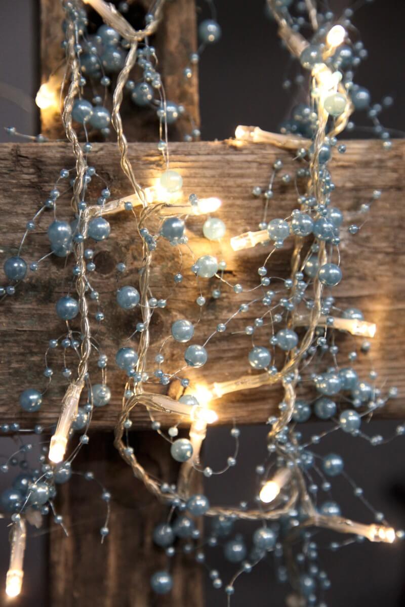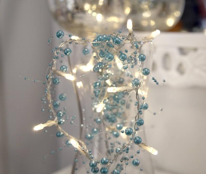 Vacker dekorationsslinga med 20 stycken LED-ljuskällor med blåa pärlor. Kan användas vid diverse dekorationer, vid tex dukningar, blomsterarrangemang, i fönster, på väggen osv. Slingan är batteridriven och har timerfunktion.