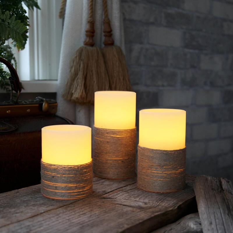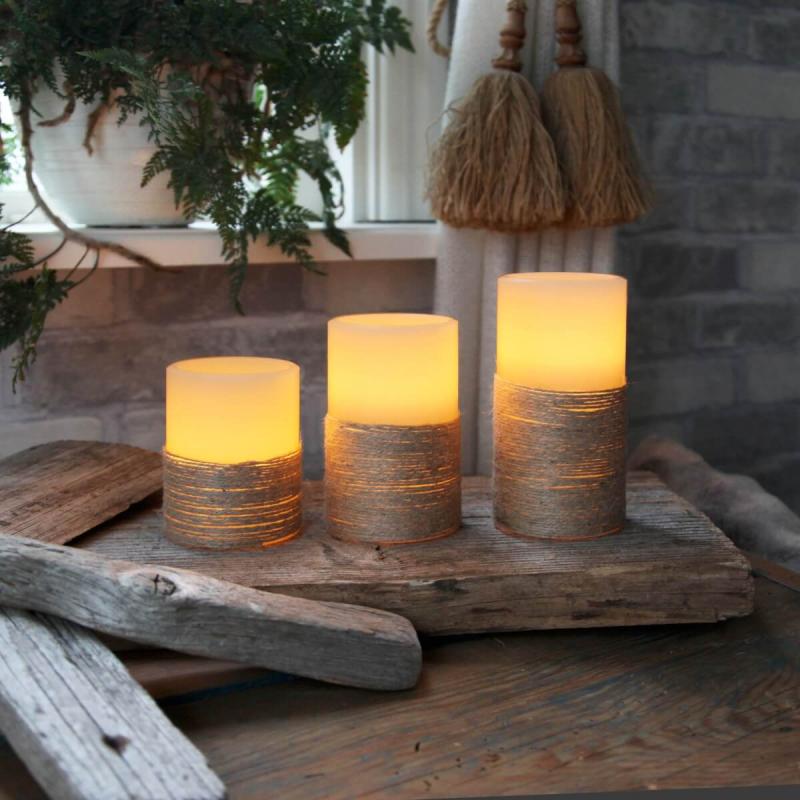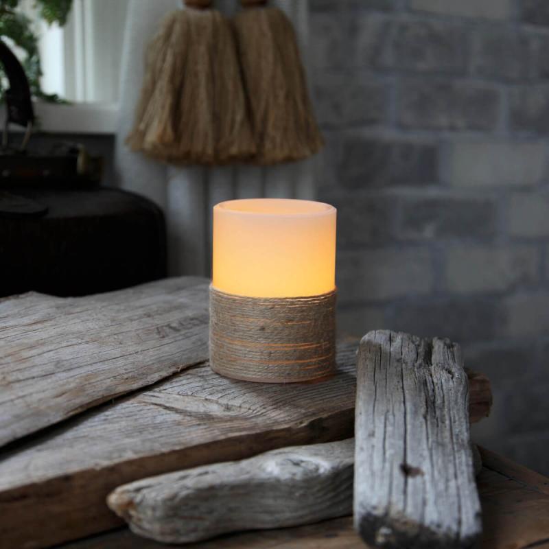 Batteridrivet vaxljus 10 cm med fina repdetaljer runt stammen. Lyser upp i hemmet och skapar en mysig stämning. Den inbyggda timern gör det lätt för dig att ställa in när vaxljuset ska lysa.