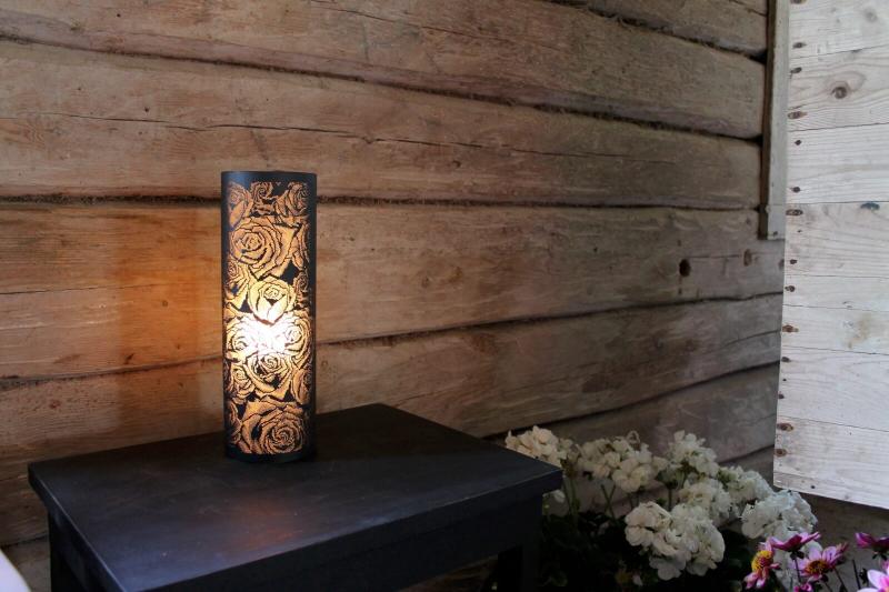 Så vacker cylinderformad bordslampa i svart laserskuren plåt som ger dig motivet av lysande rosor som en vacker bucket. Populära Ros finns i 4 olika färger.