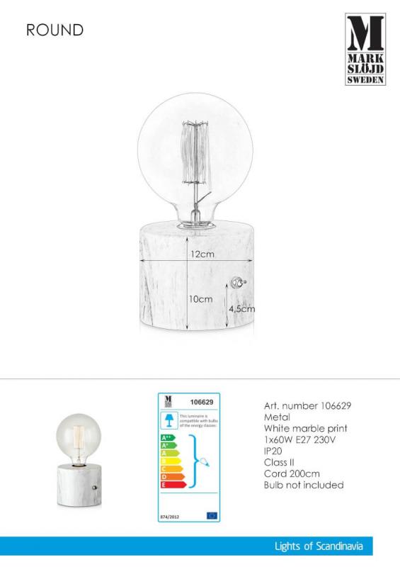 Bordslampa Round Vit från Markslöjd med marmorprint. Vippströmbrytare uppe på armaturen med 2m svart textilsladd med väggkontakt. Stor lamphållare (E27). Max 60W.