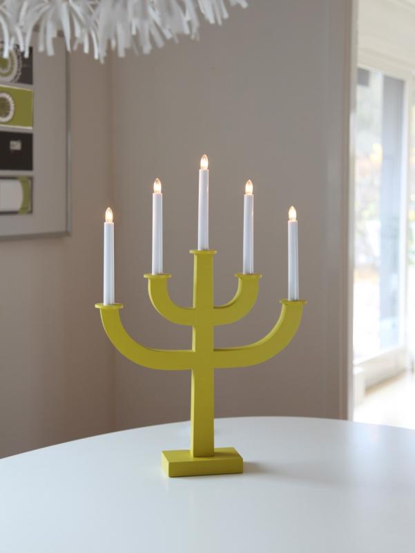 En härlig 5-armad gul träljustake som trots sin enkla design ger ett modernt och mjukt intryck