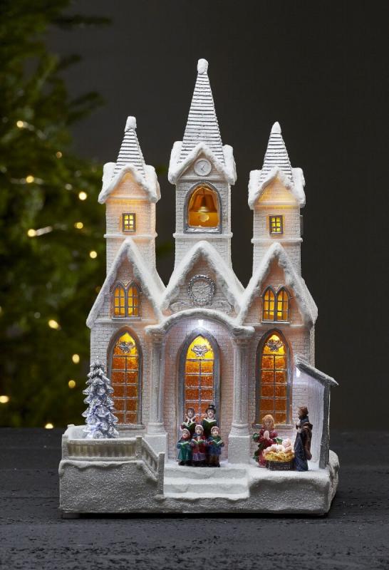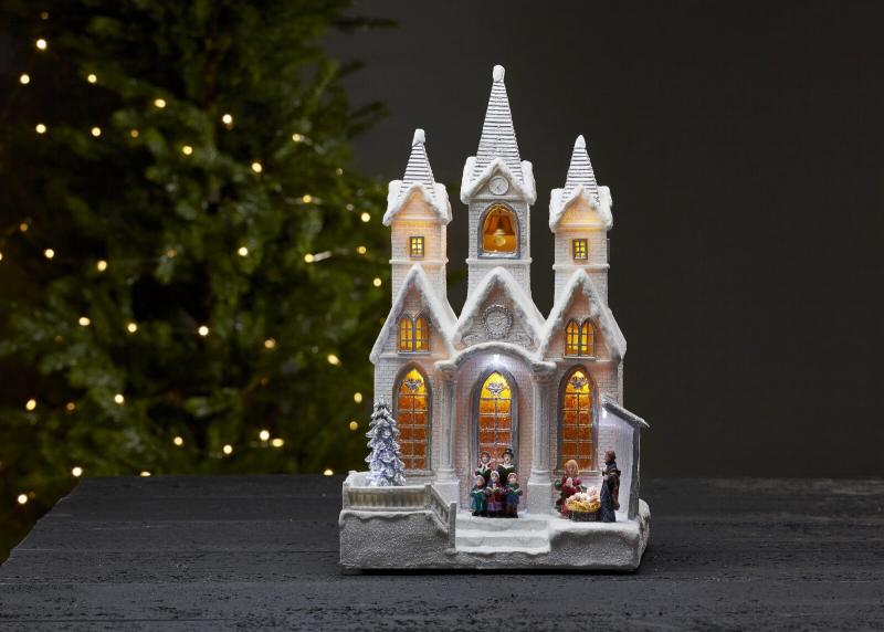Vi bara älskar denna vita Kyrkan med 8 olika julsånger och en roterande gran. Musiken styrs av timer som stänger av efter 6 timmar.