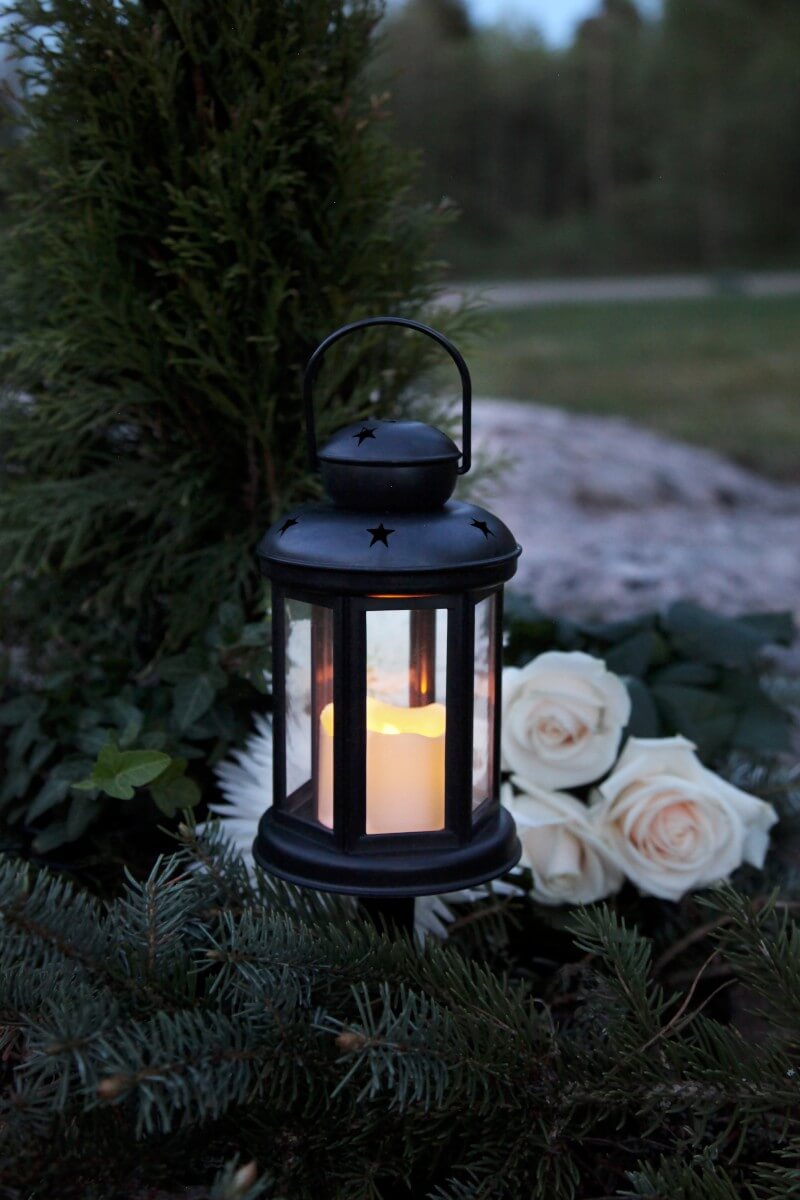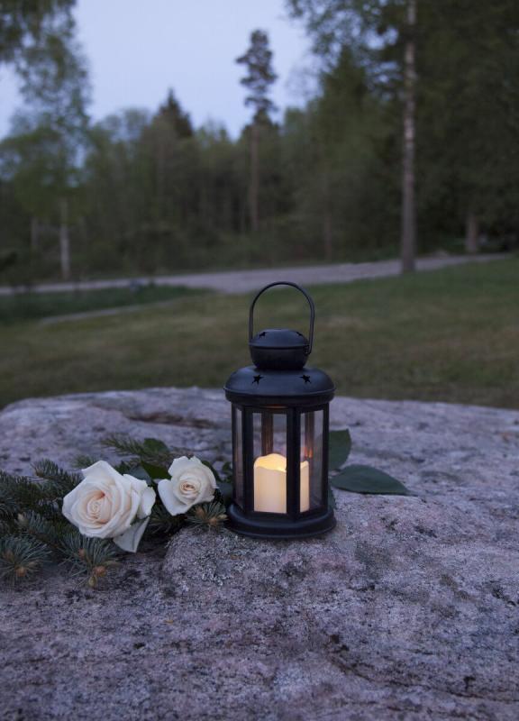 Söt svart liten lykta med ett litet batteridrivet ljus i mitten . Timerfunktionen gör det enkelt för dig att ställa in när ljuset ska lysa. Lyktan levereras med ett avtagbart stativ.