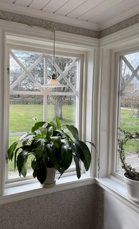 Silvia fönsterlampa från Aneta Belysning har en romantisk vintagestil som passar lika fint i klassiska, lantliga som moderna hem. Den vita glaskupan med böljande volang och ljus tvinnad textilsladd skapar en charmig ljuspunkt i fönstret. En dekorativ lampa i metall och glas som ger ett varmt, inbjudande sken och bidrar till en mysig atmosfär.