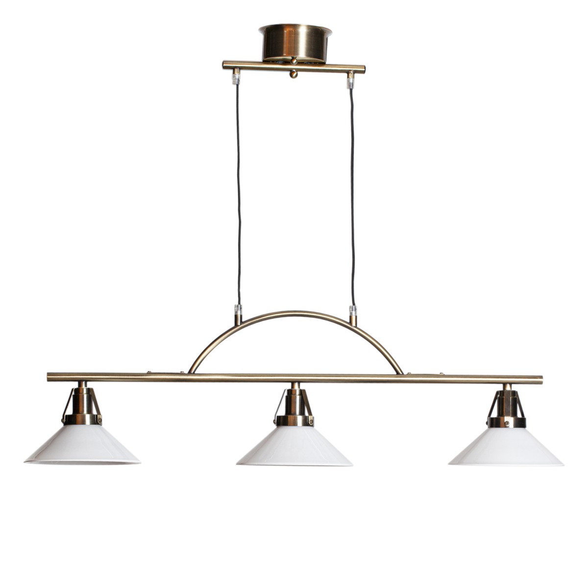 Elegant taklampa från Cottex med tre vita glasskärmar och stomme i antikmässing. Den klassiska designen ger ett tidlöst uttryck som passar perfekt över matbordet eller i vardagsrummet. Ljuset sprids jämnt och skapar en varm, inbjudande atmosfär. En stilren lampa som kombinerar tradition med modern funktion.