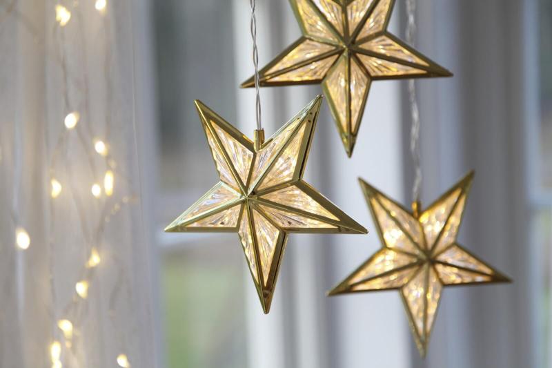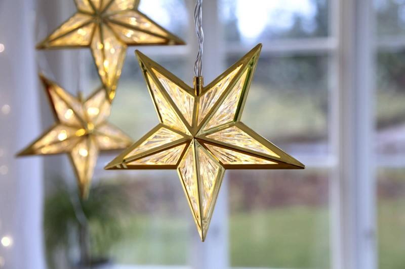 Inomhusdekoration fint dekorerad med hängande stjärnor i olika höjder med LED-ljus.