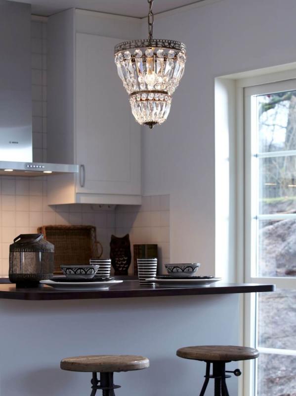 Sundsby taklampa i antikfärgad metall från Markslöjd med maskinslipade prismor. 1,5m kedja med takkåpa för krokupphäng. Takkontakt klass 1 (Jordad) medföljer. Lite (E14) lamphållare för max 40W glödljus eller motsvarande styrka i halogen, lågenergi eller LED.