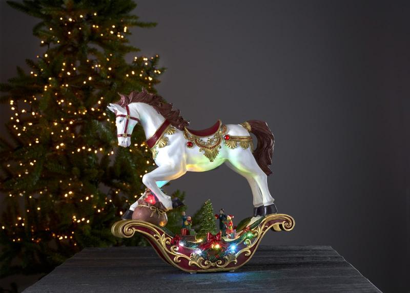 Fantastisk juldekoration i form av en stor gunghäst. Många härliga detaljer och en roterande gran. Musik, 8 st jul melodier med av/på funktion. Lyser stämningsfullt för att ge den härligaste julkänslan. Swing drivs såklart med batterier så du enkelt kan placera den var du vill i ditt hem.