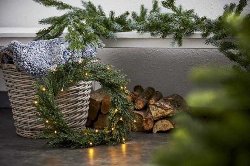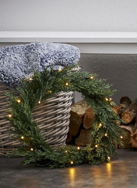 Vacker dörrkrans gjord i full PE med Thujablad och 20 varmvita LED-ljuskällor. Drivs med batteri och har en inbyggd timer så du enkelt kan ställa in när du vil att den ska lysa. För inomhus eller utomhusbruk.