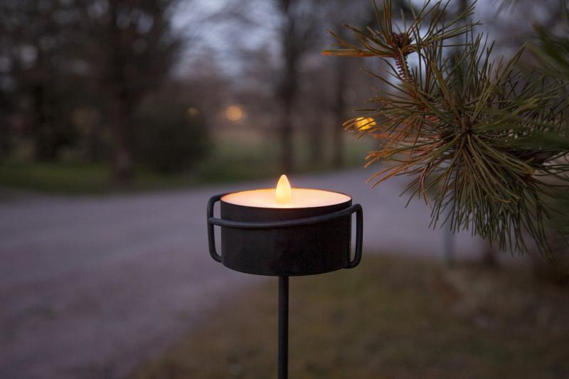 Marschall i svart plåt och vax från Star Trading. lågan lyser varierande med 18 varmvita LED som ger en realistisk flammande låga. Ljuset har timerfunktion så du enkelt kan styra över när du vill att marschallen ska lysa. Givetvis är den godkänd för utomhusbruk.