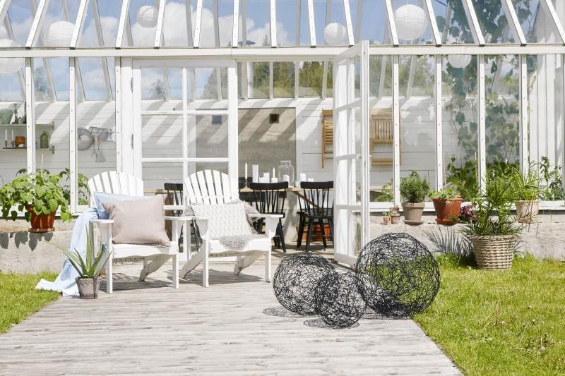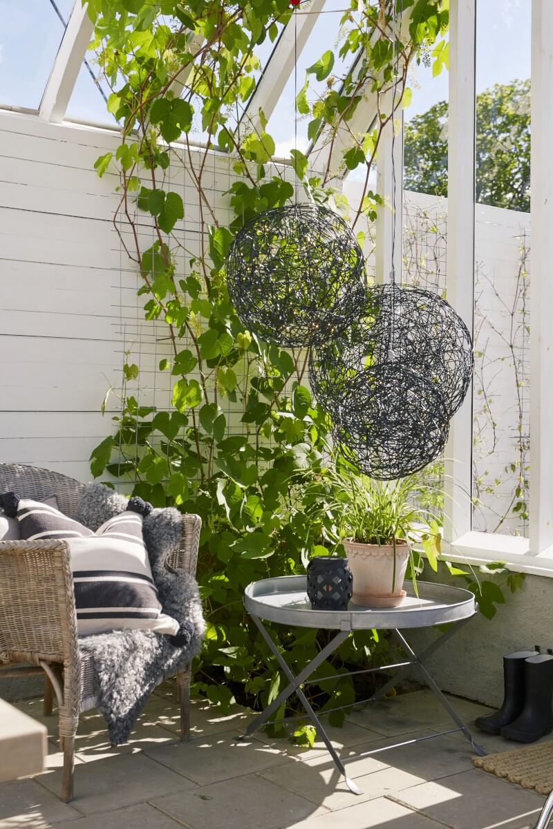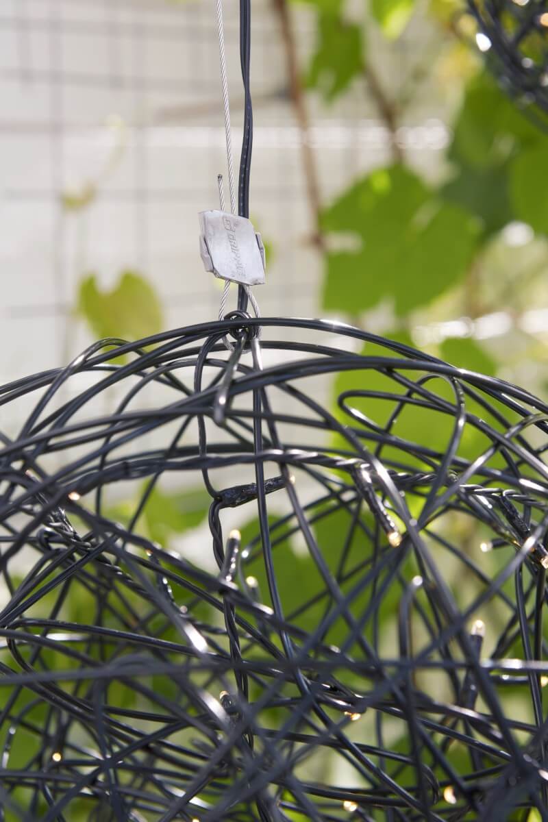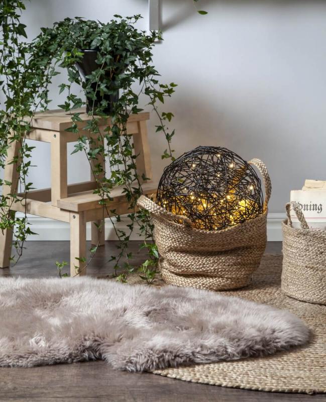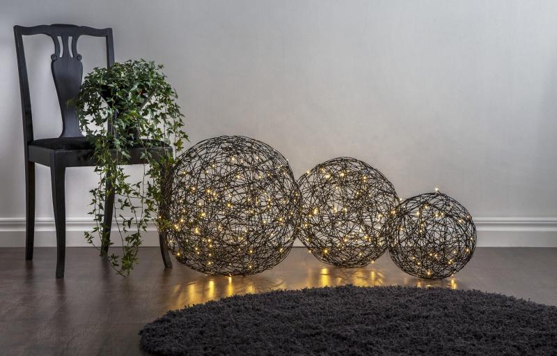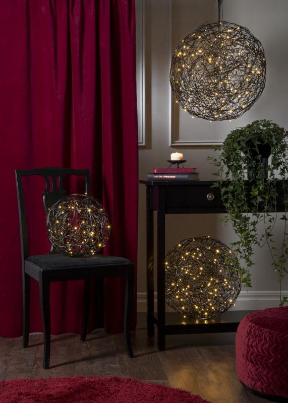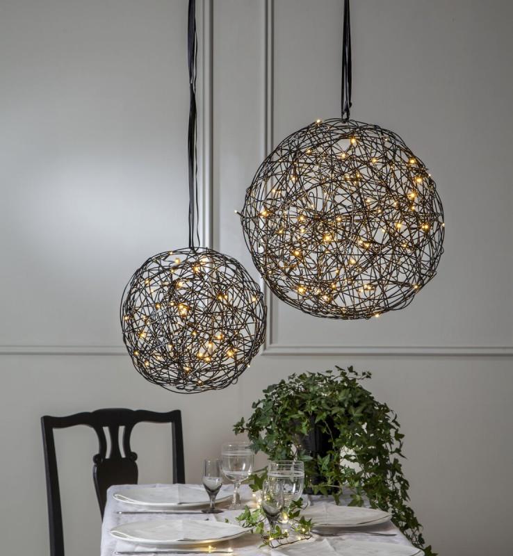 Dekorativ svart version av Trasselbollen för både inom- och utomhusbruk. Inuti dekorationen finns en LED-ljusslinga med 100 stycken små ljuspunkter som avger ett varmvitt sken. Designad av Charlotte Falck.