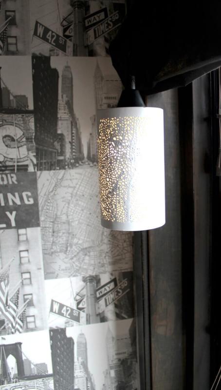 Vit fönsterlampa från Oriva i laserskuren tunn metall som bildar formen av ett träd som blir extra tydligt när lampan är tänd.