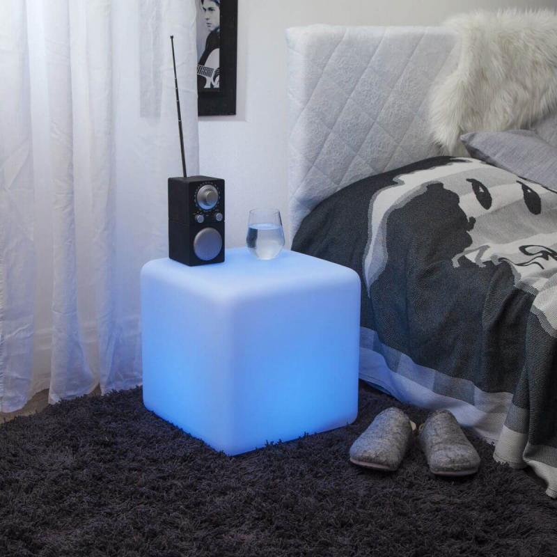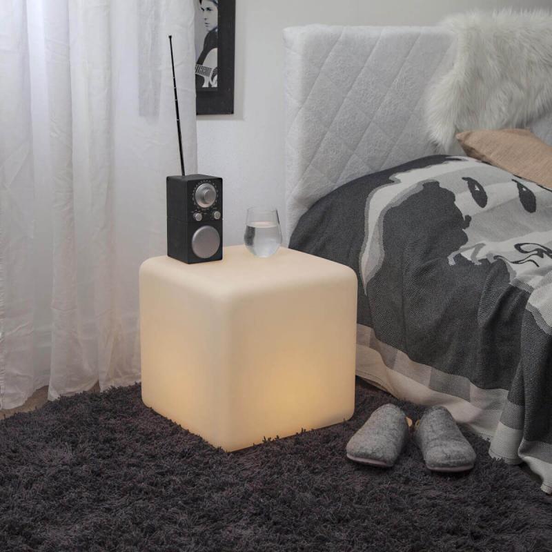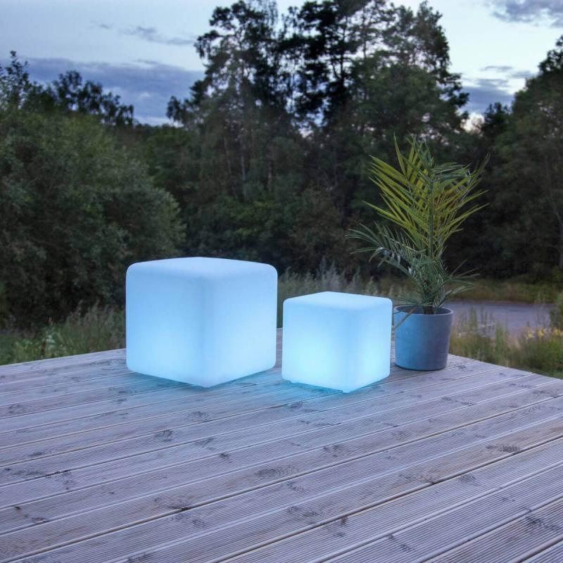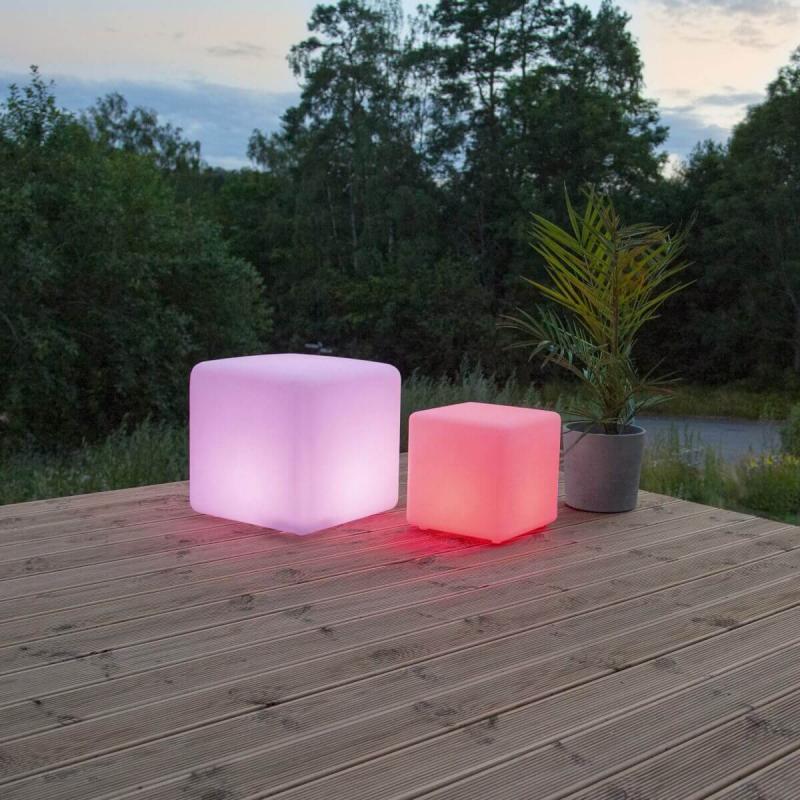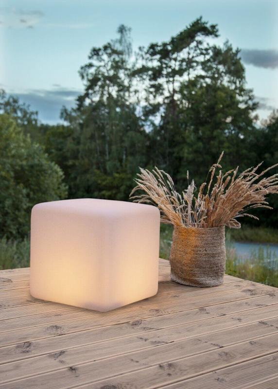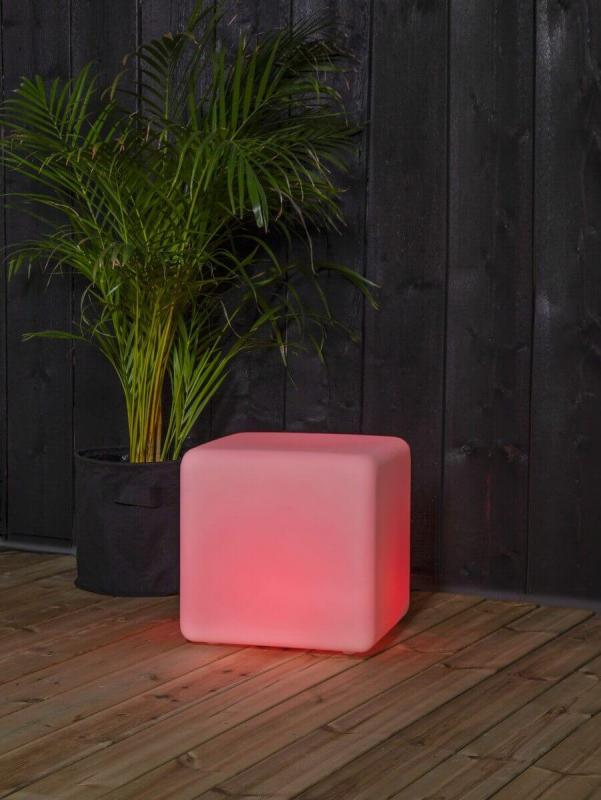 Superfin hela 40 cm hög lysande kub för utom- & inomhusbruk med fjärrkontroll från Star Trading. Välj bland skiftande färger eller ett fast ljus/färg. Inkl. uppladdningsbara batterier och transformator. Batterierna laddas av trafon och lyser upp till 8 timmar. Snyggt och kombinera olika storlekar.