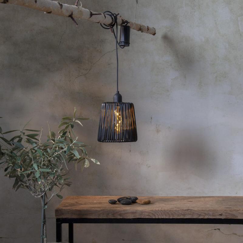 Elegant komplett lampskärm i svart konstrotting med batteridrivet upphäng för både inomhus och utomhus användning. Drivs med vanliga AA batterier och har självklart en timerfunktion så att du lätt själv kan ställa in när du vill att den ska lysa. Batterier köpes separat.