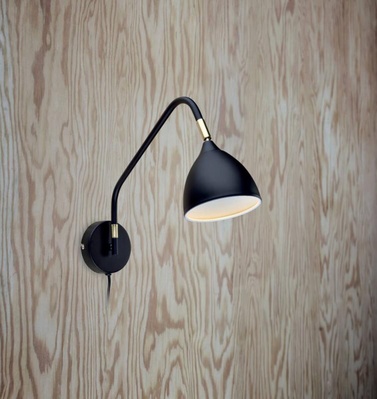 Valencia en stilren serie från Markslöjd. Svartlackerad vägglampa i metall med mässing detaljer. Ställbart lamphuvud. 2m sladd.