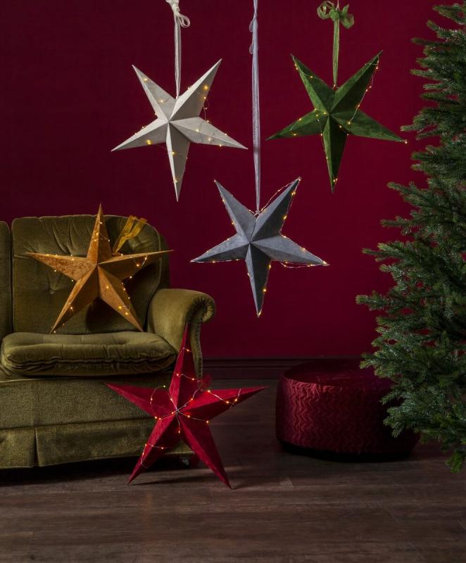 Så läcker serie med sammetsstjärnor från Star Trading, Gemensamt för dem alla är att de levereras med den snygga Dewdrop ljusslingan som du sedan virar runt stjärnan, drivs gör den med batterier, självklart med en inbyggd timer så du enkelt kan bestämma när du vill att den ska lysa. här ser du velvet i röd sammet.