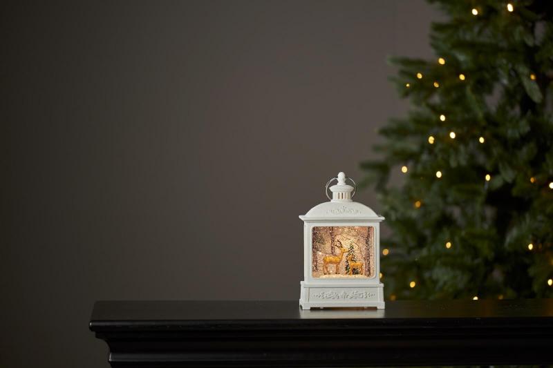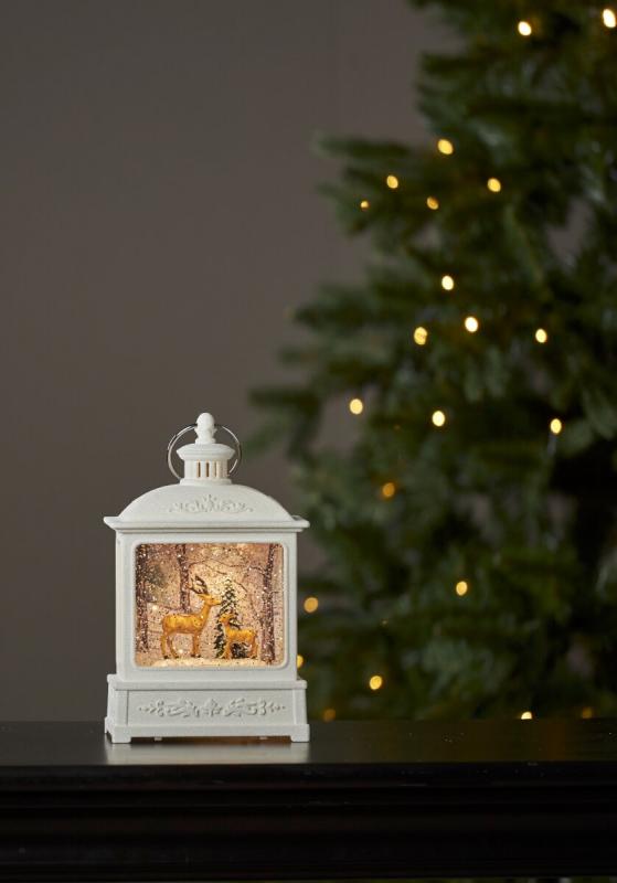 Glittrande, vattenfylld lykta från Star Trading med två hjortar med en vacker bakgrund. Glitter vätskan är i rörelse när produkten är påslagen, lyser glittrande vackert med ett varmt och behagligt sken. Placera på ett bord eller en hylla för en härlig julstämning.