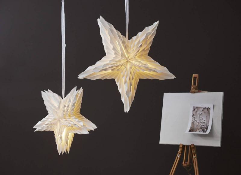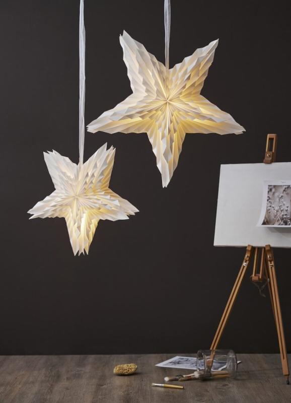 Fantastisk vit pappersstjärna på 70 centimeter från Star Trading som är tillverkad av tre lager veckat papper. Konturen följer stjärnformen och är lite ojämn för en vintrigare känsla. Ett elegant band ingår för att lättare kunna hänga upp stjärnan. Adventsstjärnan ger hemmet den där speciella julkänslan. Kan hängas både i fönster och mot en vägg. sladdställ och ljuskälla köpes separat.
