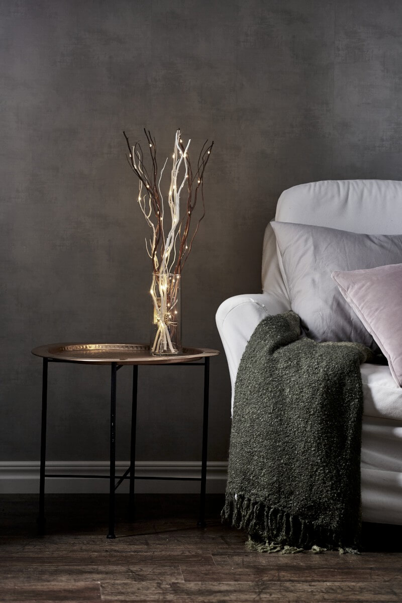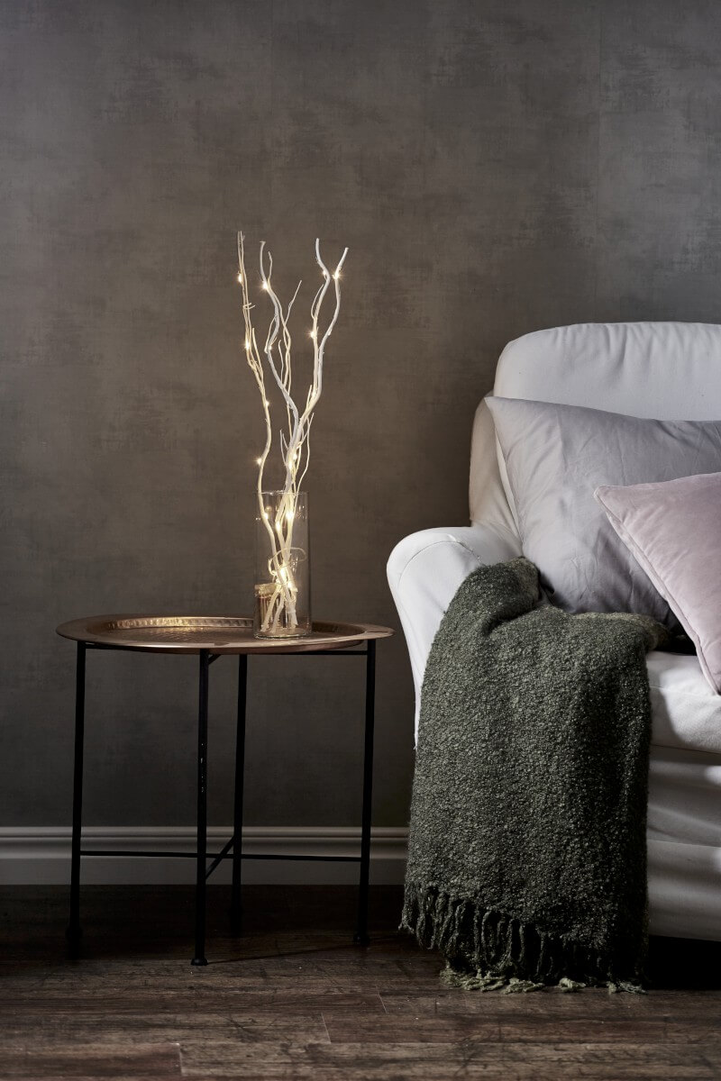 Batteridriven naturfärgad dekorationskvist med den läckra dew drop slingan invävd bland grenarna. En vacker inomhusdekoration som ger rummet en fin inredning med ljus. Kvisten har 24 LED-ljuskällor.