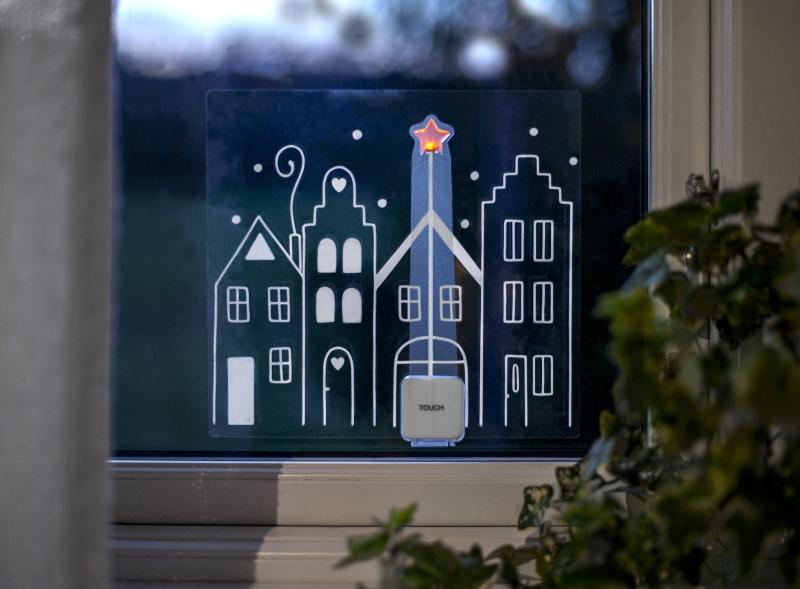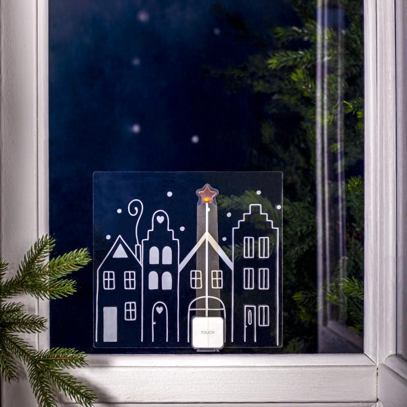 Festlig juldekoration i form av siluetten av fyra små hus. Denna fönsterdekoration kan fästas på ett fönster eller annan slät och ren yta som kylskåpet till exempel. Stjärnan som är ovanför husen lyser svagt och fint med ett varmt sken. Det är en ledljuspunkt som flammar stämningsfullt när produkten är på. Touch knapp med timer funktion. Hur festlig och kul som helst.