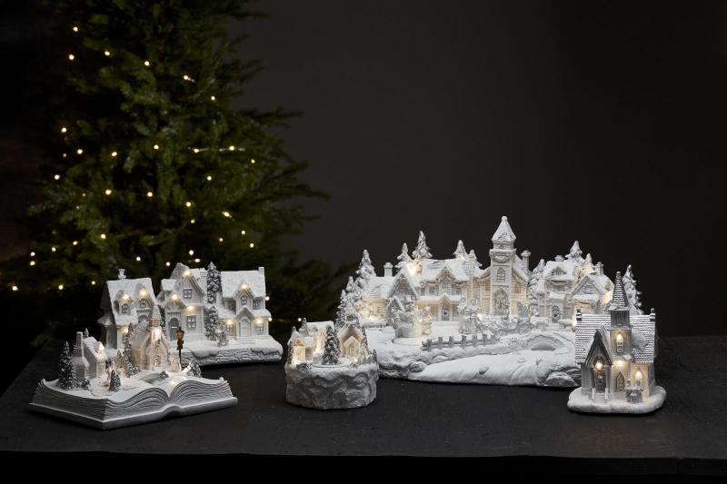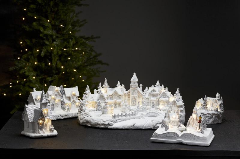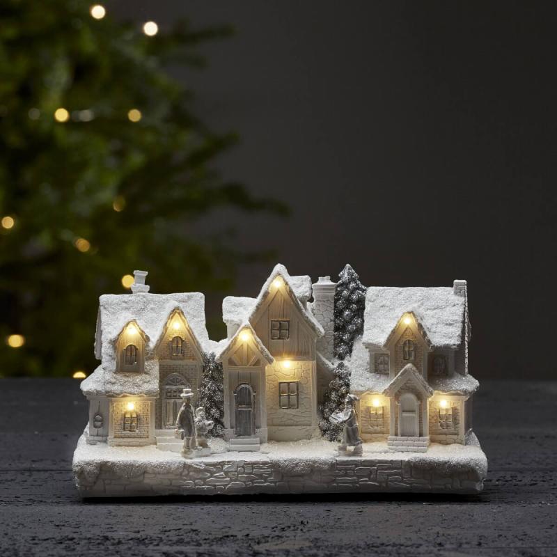 Vi tröttnar minsann aldrig på dessa söta små hus i panorama serien! Här en liten vit by, givetvis med batteridrift och timer.